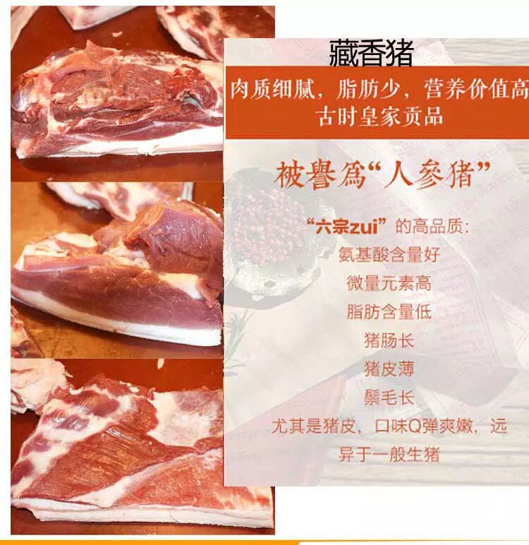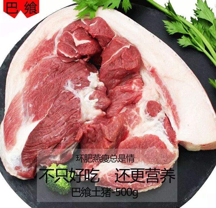巴飨生态猪品种来自本地黑猪和雪域高原藏香猪,藏香猪体型偏小、相貌类似于野猪,嘴长而尖,适宜拱翻,面部狭窄,皱纹偏少,两耳直立,鬃毛长并且容易直立,臀部相对倾斜,后躯干相对较高,四肢较为细小。 用传统的方法全心全意的喂养,以五谷杂粮、青草等天然物为饲料,无催长剂、无添加剂等,饲养场地专门为猪设置运动场和游泳场,让其每天跑一跑,游一游,身体强壮,藏香猪是含有碳酸酐酶,这是它具有惊人的抵病力和生命力,很少有疾病,也不需要注射药物。 藏香猪肉质细腻,脂肪少,营养价值高,瘦肉多可出52%以上的瘦肉。其常年生活在山林中,以山林中丰富的野生植物为食,是真正的渴饮清泉,饿食山珍,肉柔软有弹性,肉汁丰富、色泽红润,肉质紧实。 肋排:富含蛋白质、脂肪和维生素,还含有大量磷酸钙,骨胶原和骨黏蛋白等。 五花肉:丰腴嫩滑,滋味醇香,肥瘦相间,层次丰富。 如需采购,请联系:刘女士:17748000130 或扫描下方二维码 长按二维码识别关注我们