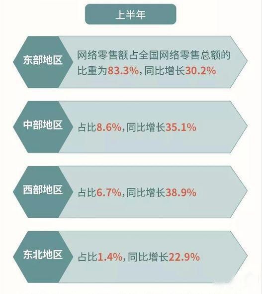 从商务大数据对重点电子商务平台监测的情况来看:上半年,从地区结构看,东部地区网络零售额占全国网络零售总额的比重为83.3%,同比增长30.2%;中部地区占比8.6%,同比增长35.1%;西部地区占比6.7%,同比增长38.9%;东北地区占比1.4%,同比增长22.9%。