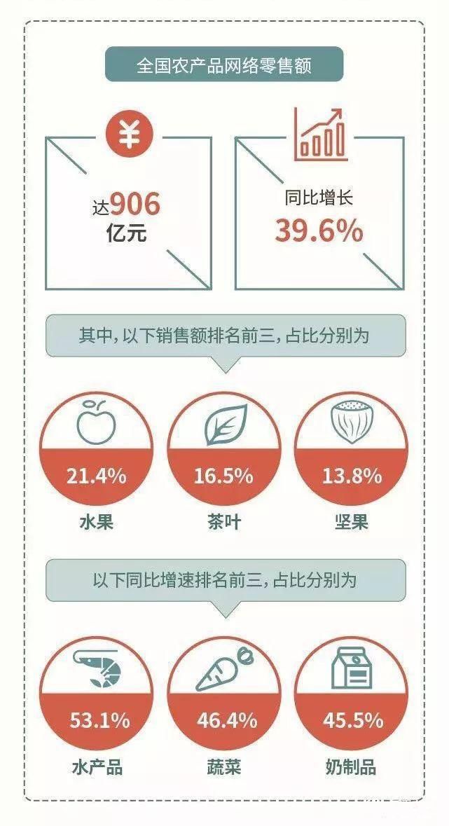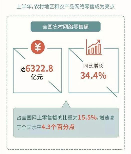 上半年,农村地区和农产品网络零售成为亮点。全国农村网络零售额达到6322.8亿元人民币,同比增长34.4%,占全国网上零售额的比重为15.5%,增速高于全国水平4.3个百分点。全国农产品网络零售额达到906亿元,同比增长39.6%。