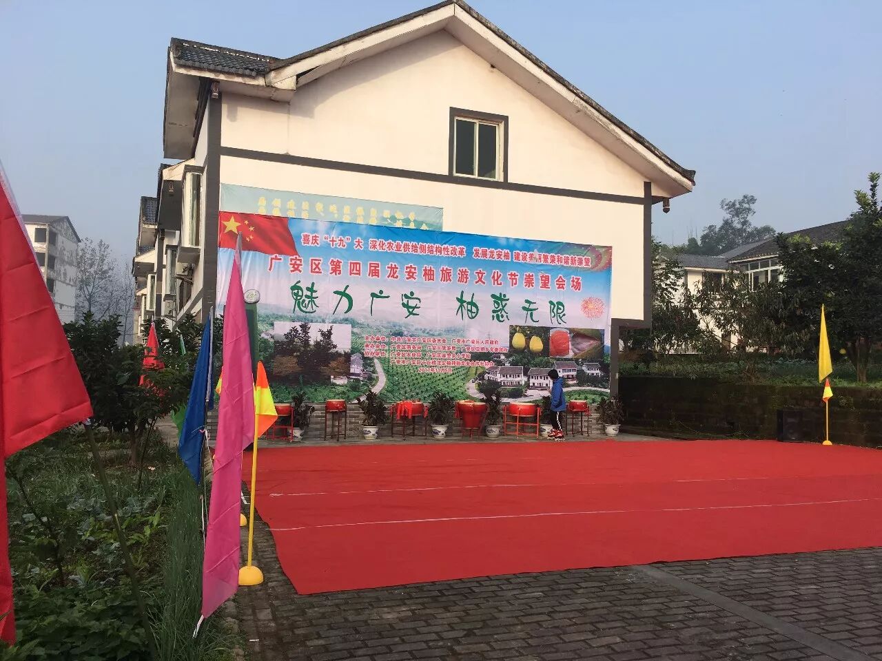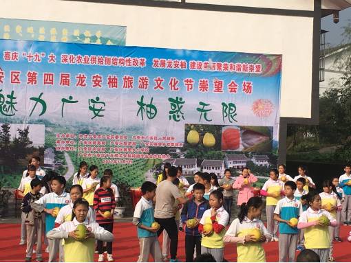 11月4日,以“农村电商”为主题的第四届龙安柚旅游文化节在龙安乡群策正式开幕,广安市电子商务和物流口岸办公室副主任李华昌、市旅发委副调研员潘小平、区委副书记陈松柏、区委常委组织部部长张建超、区政府副区长吴又成等领导参加了本次活动,区商务局、区旅游局、自愿前往的市民共1200余人参加本次活动开幕式。活动当日,举办了柚王评比、柚子彩绘、网红直播、游园采摘等活动。