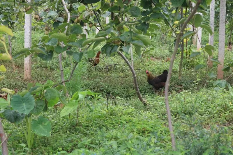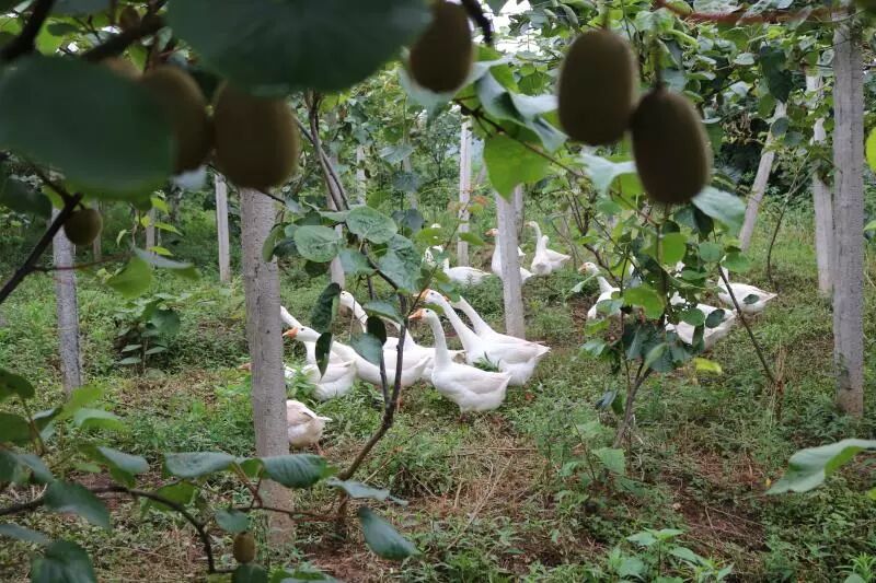 空气中弥漫着淡淡的的青草味,走近果园,景色别致,一根根水泥柱子支撑着被果实压完了腰的果树,一群土鸭和土鸡在园中自由的嬉戏着,猕猴桃的叶子被阳光反射出金灿灿的光芒。猕猴桃园里的土鸡土鸭,展现出了种养结合的魅力!鸡鸭成群啄食杂草和掉在地上的落花落果,节省了饲料成本,减少了人工除草的开支。土鸡吃虫子,减少了猕猴桃病害,避免了农药喷施。同时,禽类的粪便是优质的有机肥,为猕猴桃生长提供了养分,从而减少了场地污染,又节省了购买化肥或有机肥的费用......