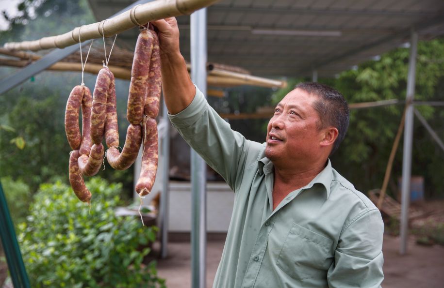 革新村党支部书记、革新专业合作社理事长杨盛荣正在制作香肠